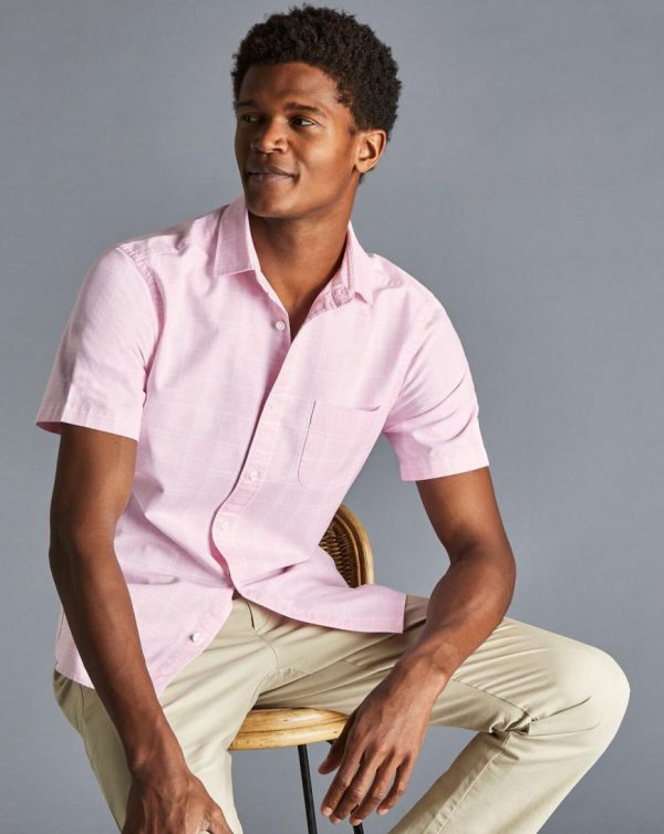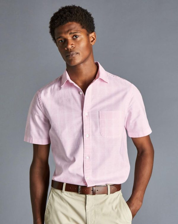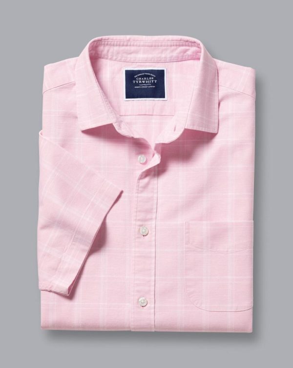 Men Cotton Linen Oxford Check Short Sleeve Shirt Pink | Charles Tyrwhitt Casual